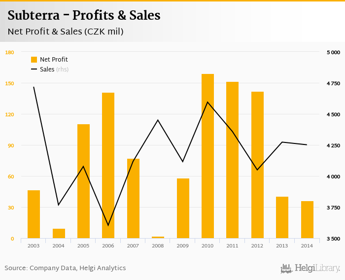 Subterra made a net profit of CZK 36.0 mil in 2014, down 11.2% compared to the previous year. Total sales reached CZK 4,251 mil, which is down 0.498% when compared to the previous year.