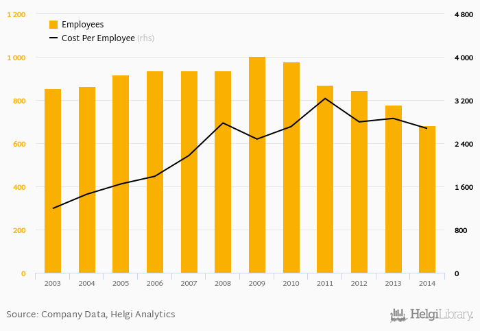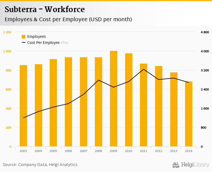 Subterra employed 681 employees in 2014, down 12.5% compared to the previous year. Historically, between 2003 and 2014, the firm's workforce hit a high of 1,002 employees in 2009 and a low of 681 employees in 2014.
