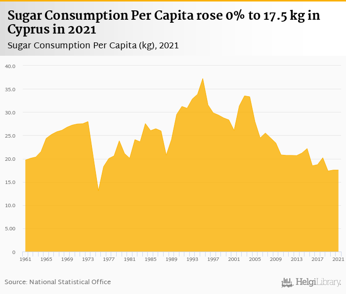 Sugar consumption per capita rose 0% to 17.5 kg in Cyprus in 2021, according to Faostat.