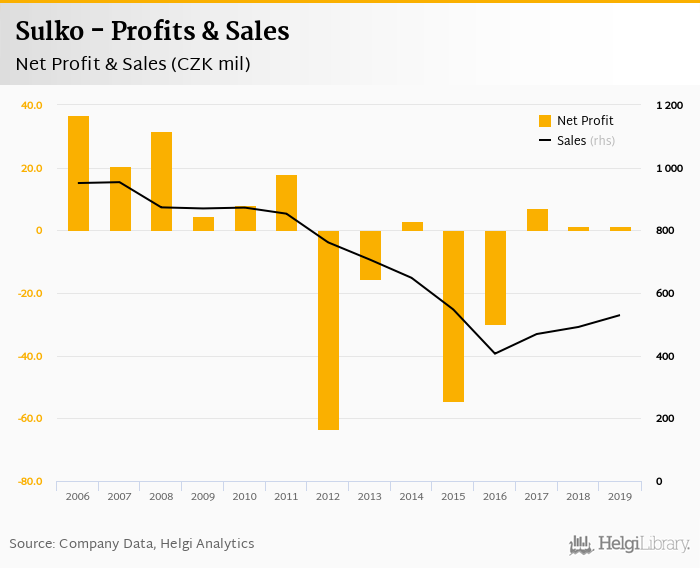 Sulko made a net profit of CZK 1.50 mil in 2019, down 2.21% compared to the previous year. Total sales reached CZK 530 mil, which is up 7.72% when compared to the previous year.