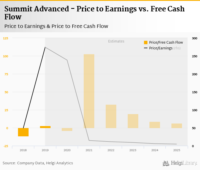 Regarding cash generated defined by the sum of net profit and depreciation, the stock traded at 88.5x at the end of 2019. When investments are excluded to get free cash flow, Summit Advanced traded at 2.71x.