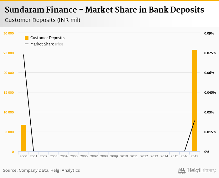 Sundaram Finance accounted for 0.023% of all customer deposits taken by banks in India at the end of 2017. Historically, the bank’s market share in customer deposits reached an all time high of 0.074% in 2000 and an all time low of 0% in 2009.