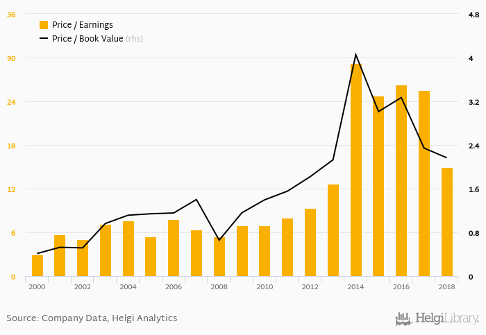 In terms of price to book value, the stock reached 2.17x at the end of 2018. Since 2013, the multiple reached an all time high of 4.05x in 2014 and an all time low of 2.17x in 2018 with an average of 2.97x.