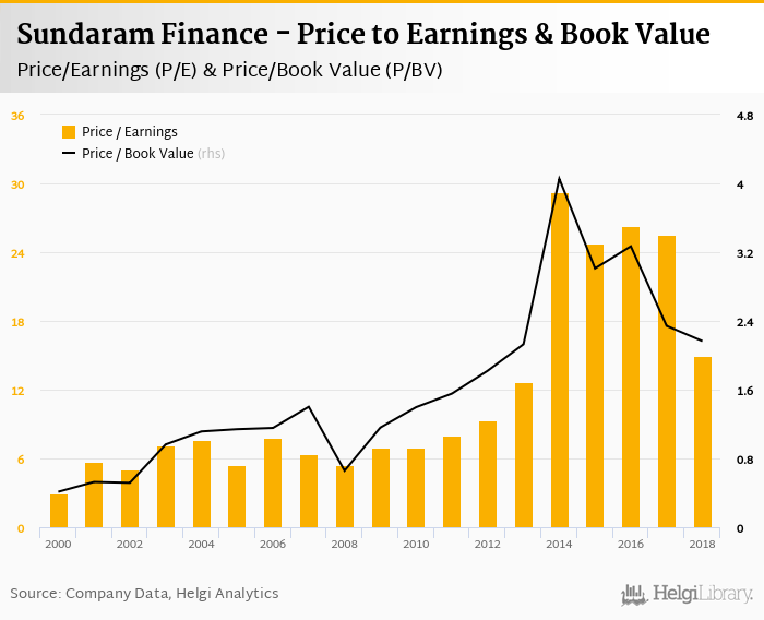 Sundaram Finance stock traded at INR 1,572 per share at the end 2018 implying a market capitalization of USD 2,481 mil.