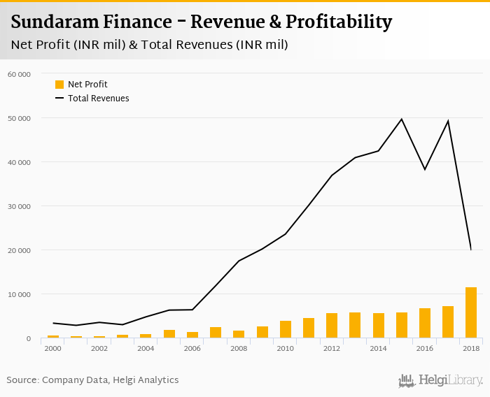 Sundaram Finance made a net profit of INR 11,609 mil under revenues of INR 19,811 mil in 2018, up 59.0% and -59.7% respectively compared to the previous year.