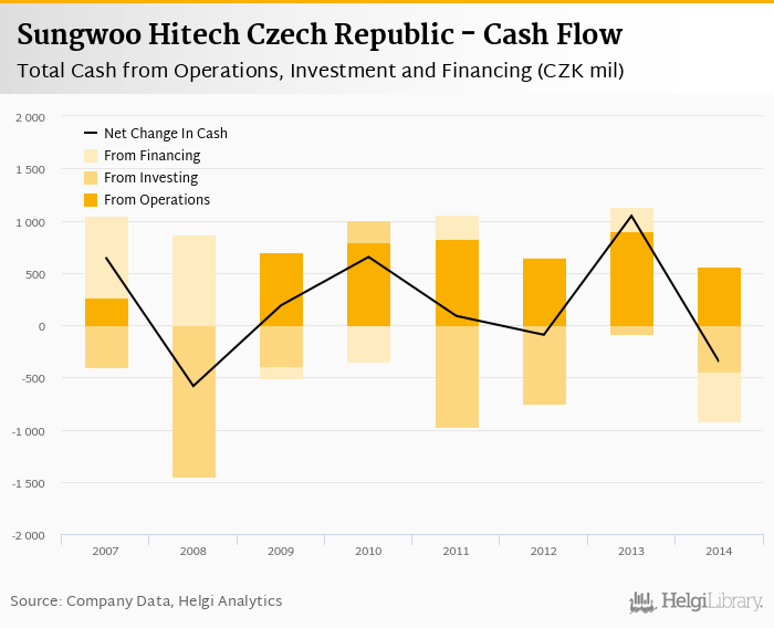 Sungwoo Hitech Czech Republic's operating cash flow stood at CZK 563 mil in 2014, down 37% when compared to the previous year. Historically, between 2007 - 2014, the firm’s operating cash flow reached a high of CZK 895 mil in 2013 and a low of CZK 3.92 mil in 2008.