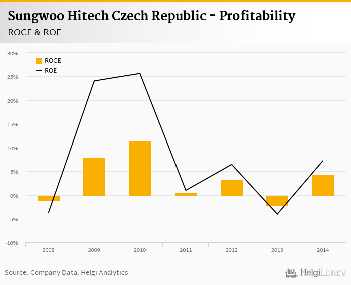 As far as Sungwoo Hitech Czech Republic's peers are concerned, Varroc Lighting Systems Czech Republic generated ROE of 39.2% and ROCE of 30.7% in 2014. Automotive Lighting's profitability reached 43.1% and 35.9%, respectively. Continental Automotive Czech Republic operated with 17.7% and 4.79% returns in 2014.
