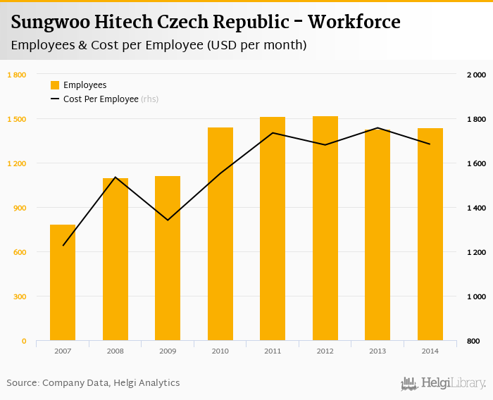 Sungwoo Hitech Czech Republic employed 1,437 employees in 2014, up 0.49% compared to the previous year. Historically, between 2007 and 2014, the firm's workforce hit a high of 1,518 employees in 2012 and a low of 784 employees in 2007.