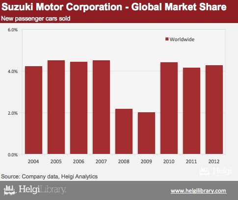 Suzuki Motor Corporation produced nearly 2.9 mil cars and 2.3 mil motorcycles in 2012. The Company produced more than 4% of the all passenger cars in the world in 2012, though its market share reached nearly 18% in Japan and nearly 38% in India in 2012
