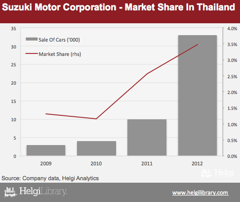 Suzuki Motor Corporation produced nearly 2.9 mil cars and 2.3 mil motorcycles in 2012. The Company produced more than 4% of the all passenger cars in the world in 2012, though its market share reached nearly 18% in Japan and nearly 38% in India in 2012