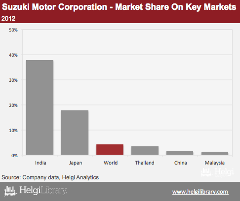 Suzuki Motor Corporation produced nearly 2.9 mil cars and 2.3 mil motorcycles in 2012. The Company produced more than 4% of the all passenger cars in the world in 2012, though its market share reached nearly 18% in Japan and nearly 38% in India in 2012