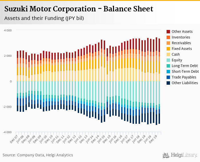 Suzuki Motor Corporation's total assets reached JPY 3,340 bil at the end of 1Q2020, down 1.83% compared to the previous year.
