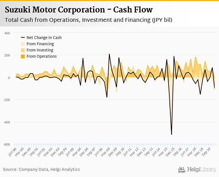 Suzuki Motor Corporation's operating cash flow stood at JPY -7.21 bil in 1Q2020, down 105% when compared to the previous year. Historically, between 2Q1999 - 1Q2020, the firm’s operating cash flow reached a high of JPY 184 bil in 1Q2018 and a low of JPY -107 bil in 4Q2008.