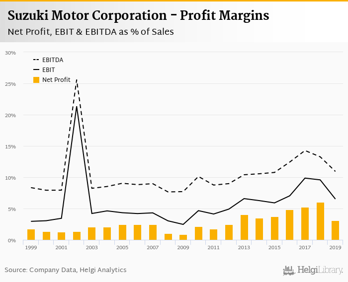 Suzuki Motor Corporation made a net profit of JPY 115 bil with revenues of JPY 3,659 bil in 2019, down by 50.7% and down by 5.49%, respectively, compared to the previous year.
