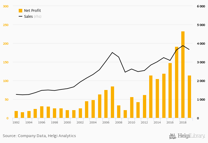 Sales have grown by 4.10% a year on average since 2009. They reached a high of JPY 3,871 bil in 2018 and a low of JPY 1,235 bil in 1993.