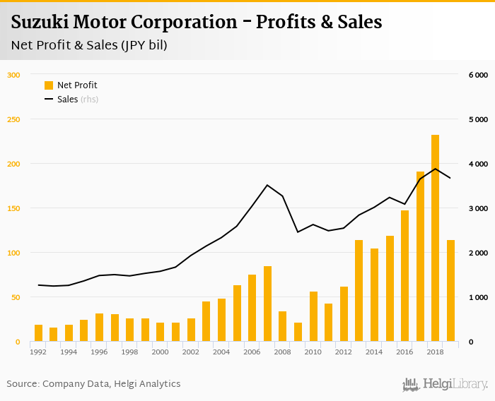 Suzuki Motor Corporation made a net profit of JPY 115 bil in 2019, down 50.7% compared to the previous year. Total sales reached JPY 3,659 bil, which is down 5.49% when compared to the previous year.
