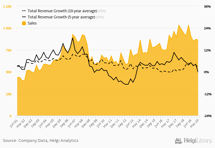 As a longer term comparison, sales have grown by an average of -0.233% a year in the last 5 years and 2.25% in the last 10 years.