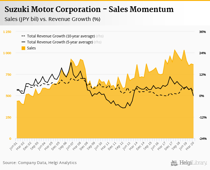 Suzuki Motor Corporation generated sales of JPY 862 bil in 1Q2020, down 16.5% compared to the previous year. Historically, between 2Q1991 and 1Q2020, the company’s sales reached a high of JPY 1,033 bil in 1Q2019 and a low of JPY 303 bil in 1Q1994.