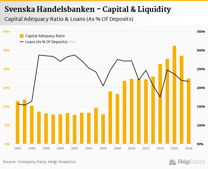 Svenska Handelsbanken's capital adequacy ratio reached 21.0% at the end of 2018, down from 28.3% compared to the previous year. Historically, the bank’s capital ratio hit an all time high of 31.4% in 2016 and an all time low of 9.30% in 2002.