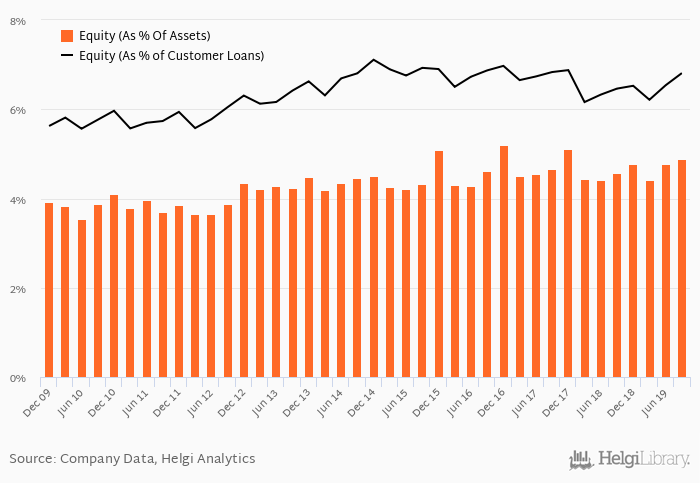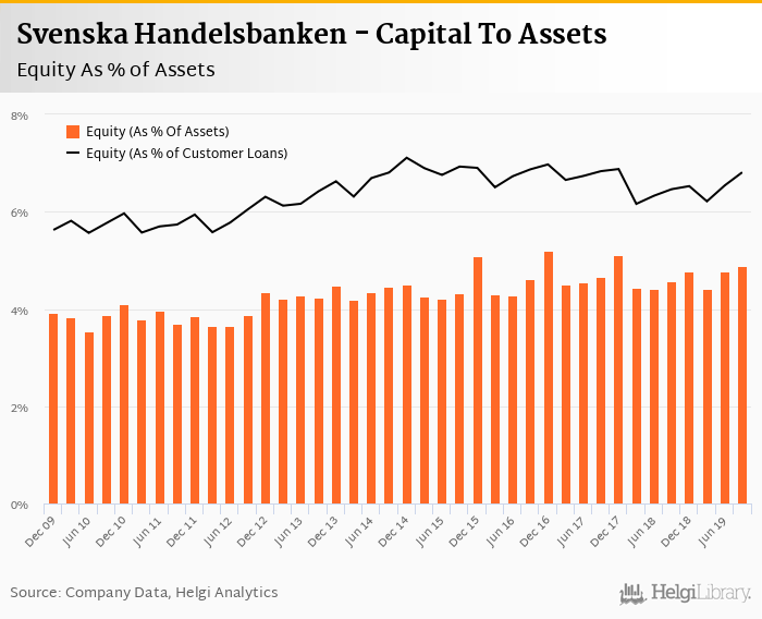 Svenska Handelsbanken's Equity reached of total assets in the 3Q2019, up from 64.4% for the previous year. As a share of net customer loans, the ratio amounted to at the end of the third quarter of 2019.