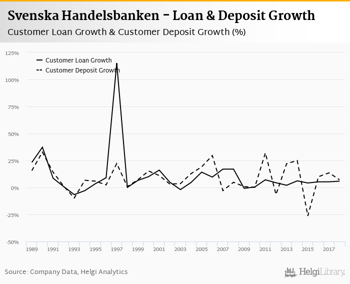 Svenska Handelsbanken's customer loan growth reached 5.87% in 2018, up from 5.27% compared to the previous year. Historically, the bank’s loans growth reached an all time high of 115% in 1997 and an all time low of -6.60% in 1993. In the last decade, the average annual loan growth amounted to 3.97%.