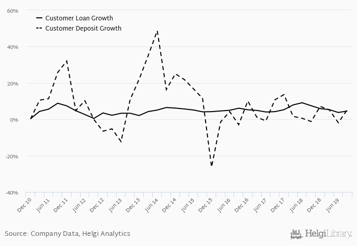 On the other hand, bank's customer deposit growth amounted to 5.37% at the end of 2019-09-30, up from -1.23% when compared to the previous year. Historically, the bank’s deposit growth reached an all time high of 48.7% in 2014-06-30 and an all time low of -26.2% in 2015-12-31. In the last decade, the average annual loan growth amounted to 0%.