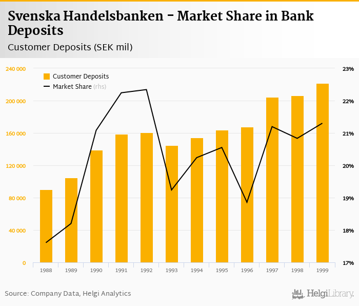 Svenska Handelsbanken accounted for 21.3% of all customer deposits taken by banks in Sweden at the end of 1999. Historically, the bank’s market share in customer deposits reached an all time high of 22.3% in 1992 and an all time low of 17.6% in 1988.