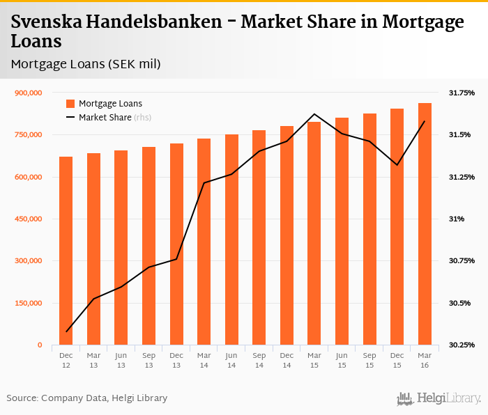 Svenska Handelsbanken's mortgage loans reached SEK 864,895 mil in 1Q2016, up 2.43% compared to the previous year.