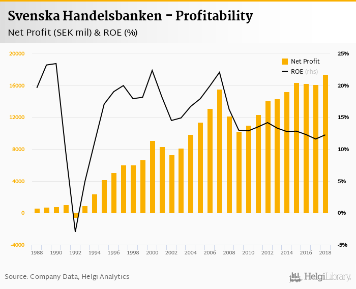 Svenska Handelsbanken made a net profit of SEK 17,354 mil in 2018, up 7.80% compared to the previous year. This implies a return on equity of 12.2%.