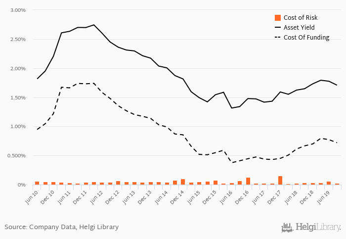 Historically, the bank’s cost of risk reached an all time high of 0.157% in 4Q2017 and an all time low of 0.021% in 1Q2018. The average cost of risk in the last six quarters amounted to 0.035%.