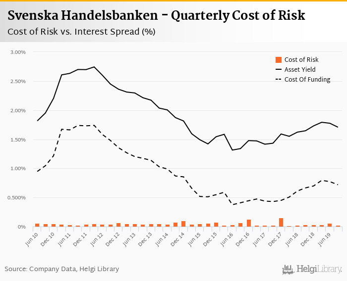 Svenska Handelsbanken's Cost of Risk (loan loss provisions as % of total assets) amounted to 0.024% in the third quarter of 2019, down from 0.056% when compared to the previous quarter.