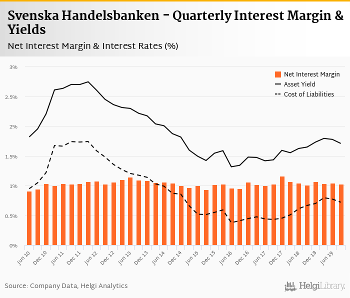 Svenska Handelsbanken's net interest margin amounted to 1.02% in the third quarter of 2019, down from 1.04% when compared to the previous quarter.