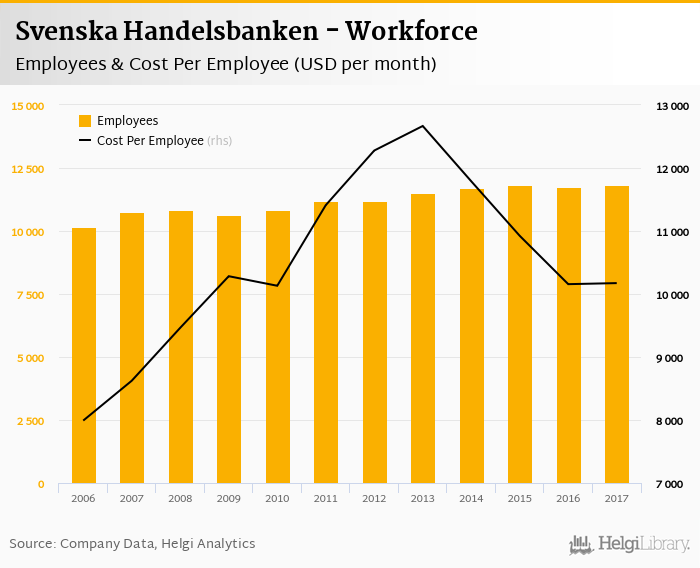 Svenska Handelsbanken employed 11,832 persons in 2017, up 0.621% when compared to the previous year. Historically, the bank's workforce hit an all time high of 11,832 persons in 2017 and an all time low of 10,163 in 2006.