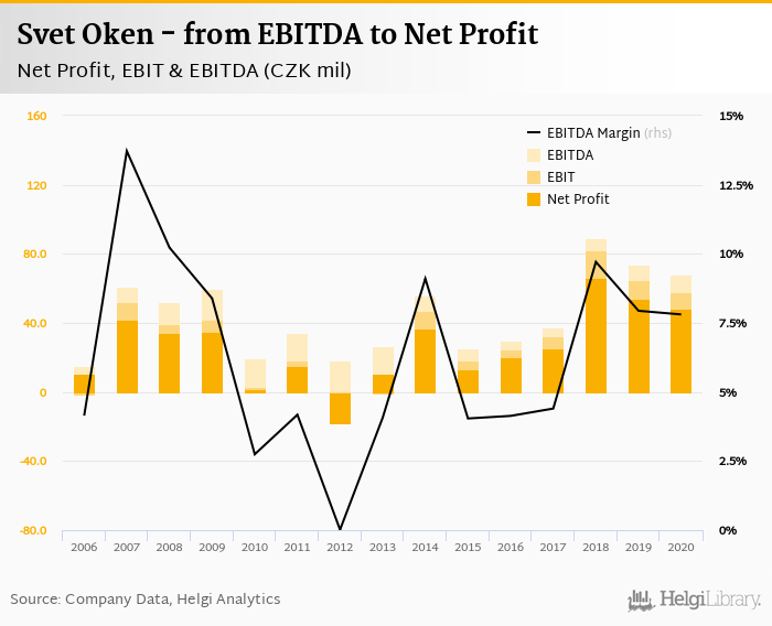 Svet Oken made a net profit of CZK 48.6 mil with revenues of CZK 874 mil in 2020, down by 9.68% and down by 6.17%, respectively, compared to the previous year. This translates into a net margin of 5.56%.