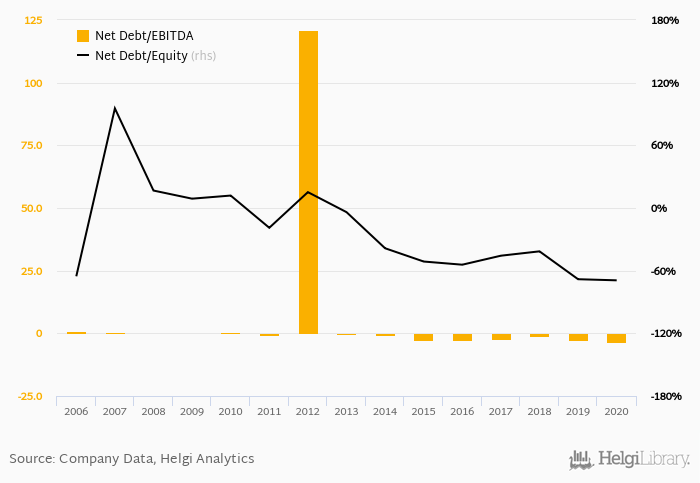 Historically, the firm’s net debt to equity reached a high of 95.4% in 2007 and a low of -69.3% in 2020 between 2006 and 2020. The average for the last five years was -55.8%.