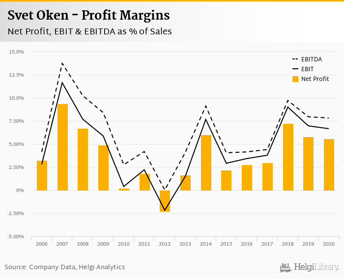 Svet Oken made a net profit of CZK 48.6 mil with revenues of CZK 874 mil in 2020, down by 9.68% and down by 6.17%, respectively, compared to the previous year.