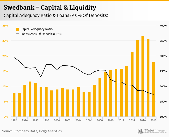 Swedbank's capital adequacy ratio reached 21.5% at the end of 2018, down from 30.7% compared to the previous year. Historically, the bank’s capital ratio hit an all time high of 31.8% in 2016 and an all time low of 9.30% in 1992.