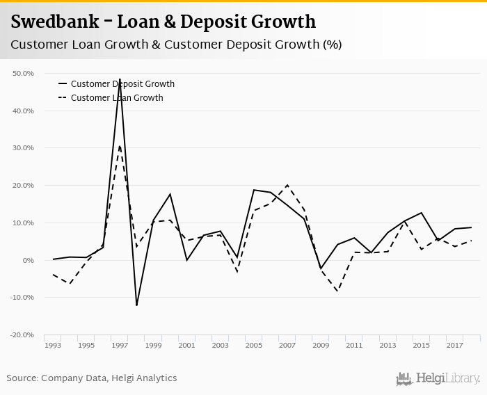 Swedbank's customer loan growth reached 5.13% in 2018, up from 3.55% compared to the previous year. Historically, the bank’s loans growth reached an all time high of 30.9% in 1997 and an all time low of -8.48% in 2010. In the last decade, the average annual loan growth amounted to 2.12%.
