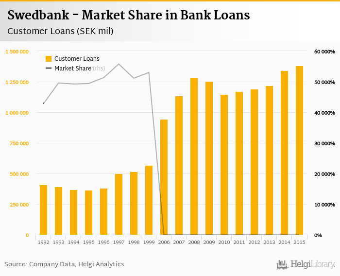 Swedbank accounted for 23.2% of all customer loans issued in Sweden at the end of 2015. Historically, the bank’s market share in customer loans reached an all time high of 55,758% in 1997 and an all time low of 0% in 2006.