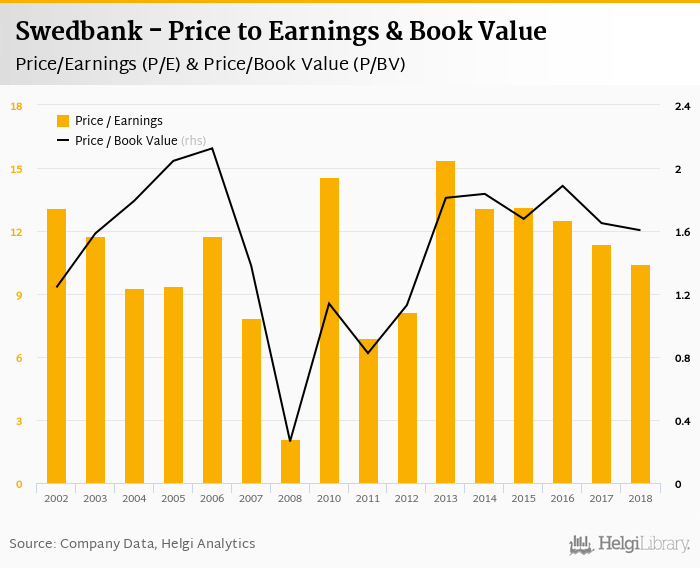 At the end of 2018, the bank traded at price to earnings of 10.4x. Within the last five years, the multiple reached an all time high of 13.2x in 2015 and an all time low of 10.4x in 2018 with an average of 12.1x.
