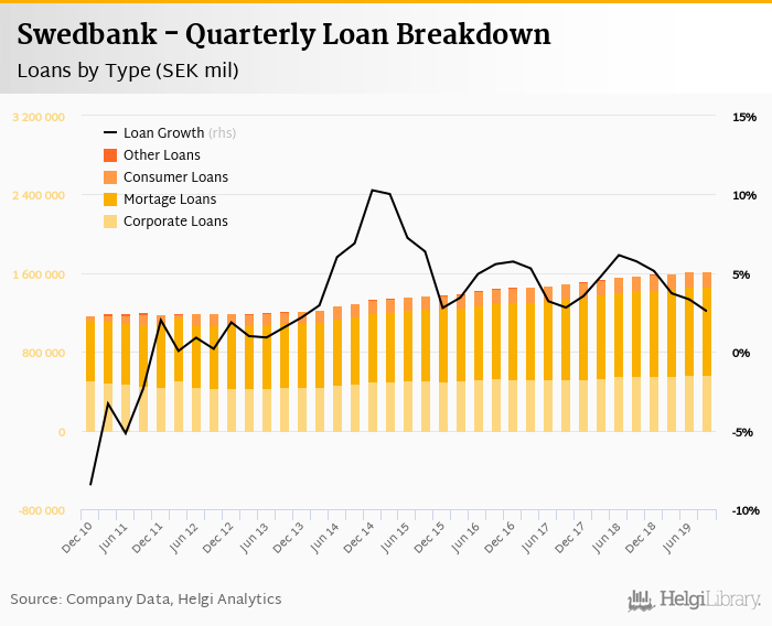 Swedbank's loans reached SEK 1,621,400 mil in the third quarter of 2019, down from SEK 1,621,690 mil when compared to the previous quarter and up from SEK 1,580,270 mil when compared to the same period of last year. Historically, the bank’s loans reached an all time high of SEK 1,621,690 mil in 2Q2019 and an all time low of SEK 1,167,710 mil in 4Q2010.