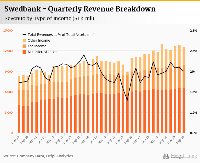 Swedbank generated total banking revenues of SEK 12,515 mil in the third quarter of 2019, up 1.81% when compared to the same period of last year and down 2.83% when compared to the previous quarter.