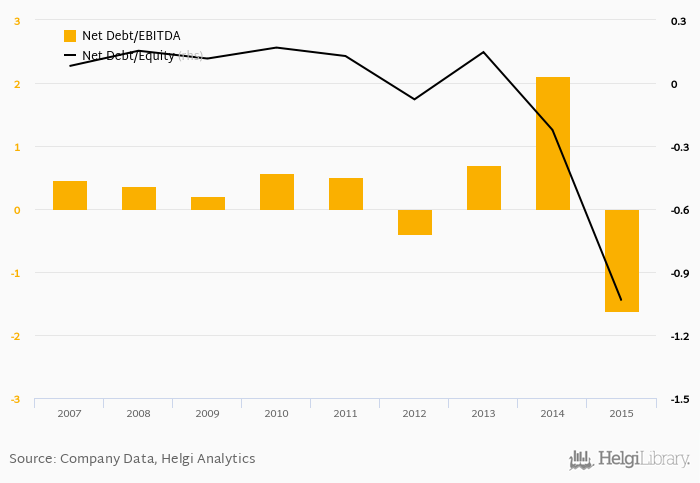Net debt to EBITDA was calculated at -1.62x at the end of the year. That is down from 0.579x seen in 2010. The ratio reached a high of 2.11x in 2014 and a low of -1.62x in 2015.