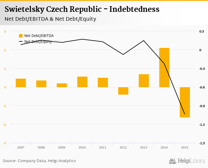 Swietelsky Czech Republic's net debt stood at CZK -609 mil and accounted for -1.04 of equity at the end of 2015. The ratio is down 0.813 pp compared to the previous year.