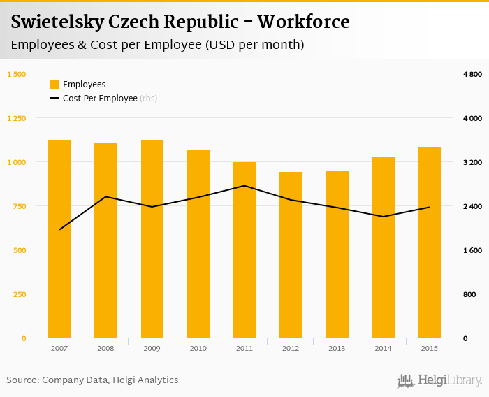 Swietelsky Czech Republic employed 1,082 employees in 2015, up 4.84% compared to the previous year. Historically, between 2007 and 2015, the firm's workforce hit a high of 1,124 employees in 2009 and a low of 945 employees in 2012.