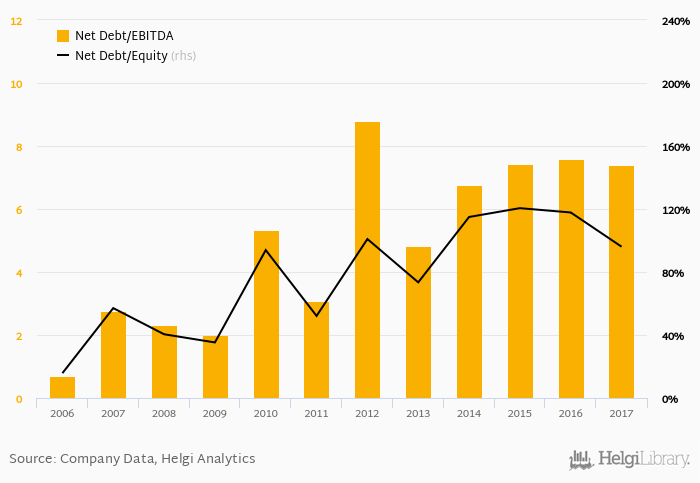 Historically, the firm’s net debt to equity reached a high of 121% in 2015 and a low of 15.8% in 2006 between 2006 and 2017. The average for the last five years was 105%.