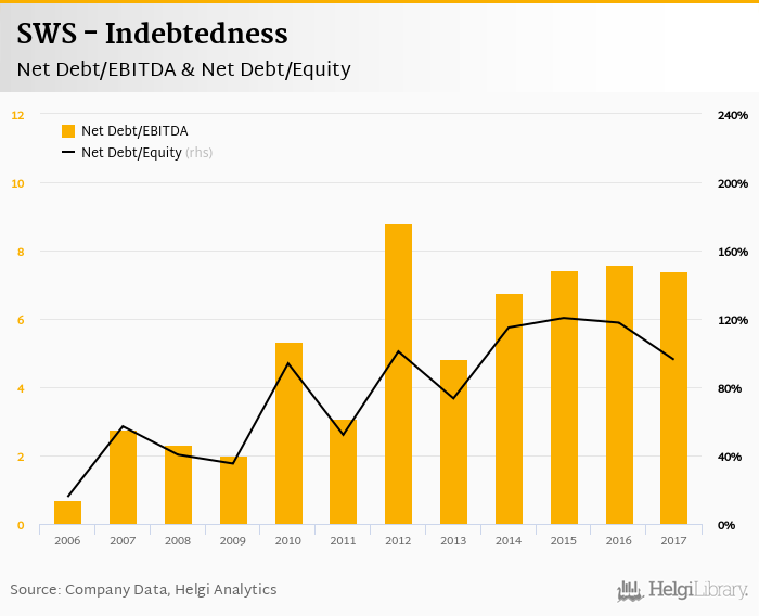 SWS's net debt stood at CZK 1,164 mil and accounted for 96.1% of equity at the end of 2017. The ratio is down 21.7 pp compared to the previous year.