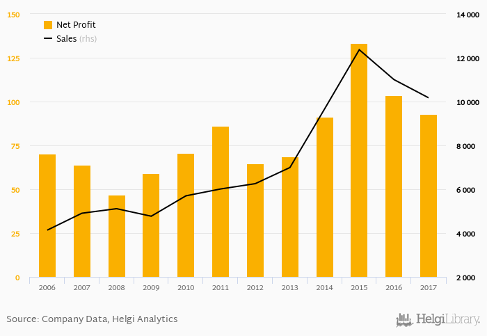 Sales have grown by 7.57% a year on average since 2007. They reached a high of CZK 12,365 mil in 2015 and a low of CZK 4,132 mil in 2006.