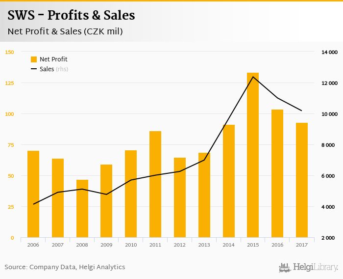SWS made a net profit of CZK 92.8 mil in 2017, down 10.5% compared to the previous year. Total sales reached CZK 10,172 mil, which is down 7.56% when compared to the previous year.