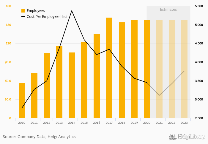 Staff cost represented 37.3% of sales in 2020, 13.8 pp higher than a decade ago.